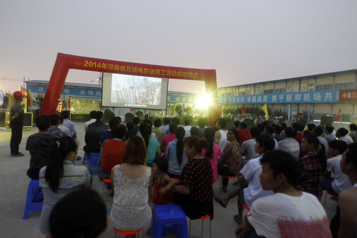 6月10日晚8時, 鄭州機場二期工程建設工地中建三局新鄭機場T2航站樓項目指揮部大院內(nèi)人聲鼎沸、歡歌陣陣,由中共河南省委宣傳部、河南省廣電局、鄭州機場二期工程建設指揮部主辦,鄭州市文化廣電新聞出版局、河南新農(nóng)村數(shù)字電影院線有限公司、鄭州商都數(shù)字電影院線有限公司、中建三局新鄭機場T2航站樓項目部承辦的2014年河南省萬場電影送民工活動啟動儀式如期舉行,300余名鄭州機場二期工程參建人員興致勃勃地觀看了河南影視制作集團出品的《永遠的焦裕祿》和《新少林寺》等影片。河南省委宣傳部常務副部長王耀;河南省新聞出版廣電局黨組副書記、副局長宋鳳仙;鄭州機場二期工程建設指揮部副指揮長、河南城際鐵路公司常務副總經(jīng)理劉光明等領導同志出席了啟動儀式。